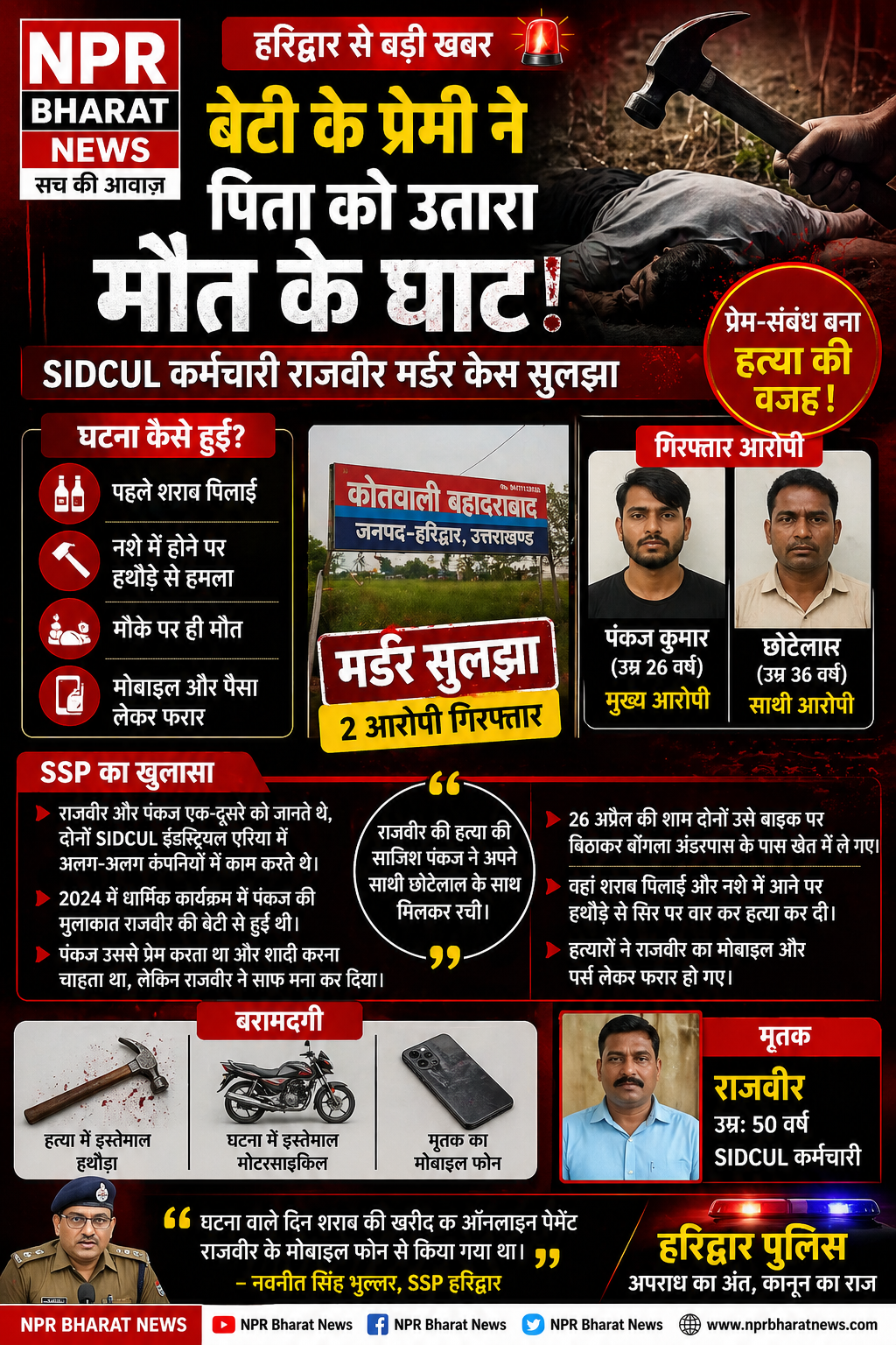 हरिद्वार: बहादराबाद कोतवाली पुलिस ने सिडकुल (SIDCUL) कर्मचारी राजवीर की हत्या का मामला सुलझा लिया है। मृतक की बेटी के कथित प्रेमी ने, अपने एक साथी के साथ मिलकर, पहले राजवीर को शराब पिलाई और फिर हथौड़े से पीट-पीटकर उसकी हत्या कर दी और मौके से फरार हो गया। पुलिस ने मुख्य आरोपी—26 वर्षीय पंकज कुमार—और 36 वर्षीय छोटेलाल को गिरफ्तार कर लिया है। आरोपियों से मिली जानकारी के आधार पर, पुलिस ने अपराध में इस्तेमाल किया गया हथौड़ा और मोटरसाइकिल भी बरामद कर ली है। SSP नवनीत सिंह भुल्लर ने रोशनबाद पुलिस मुख्यालय में आयोजित एक प्रेस कॉन्फ्रेंस के दौरान पूरे मामले का विवरण साझा किया।